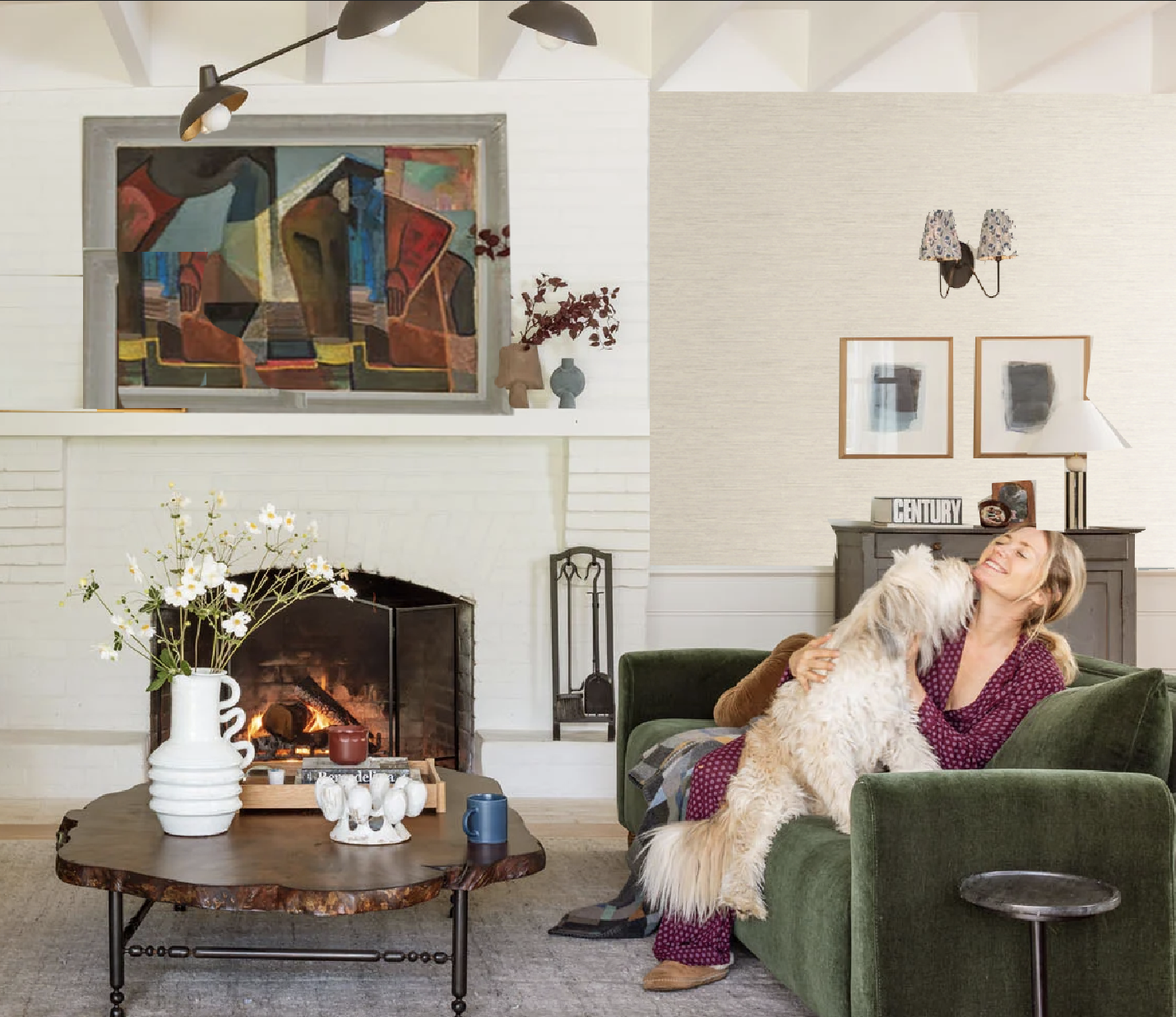 I keep wanting to see more traditional and English country house things in this room/house. more old things. a rich, vintage rug with deep red or brown tones would do wonders. something earthy. if you get a new piece for the wall, make it a vintage piece. how about the cupboard that’s in the carriage house? like, if the vibe is Scandi, a beautiful, old Scandinavian cabinet, maybe with painted embellishments. a tight palette is great, but then there needs to be textural and material variation. different fabrics, stone, old woods of varying colors.
