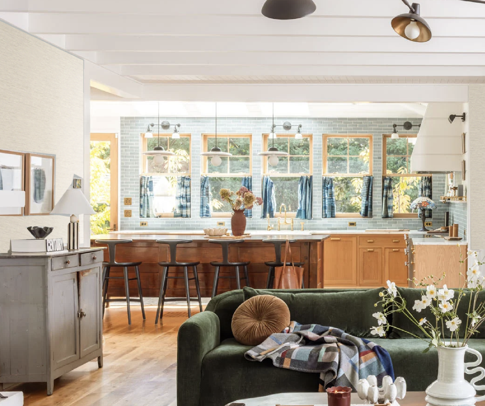 Well, for you eagle-eyed readers (thank you!), you’ll notice that I swapped the midcentury cabinet and the French farmhouse cabinet, and my goodness, it’s so much better. The blue cabinet looked sad and grey over there and it gets way more light where it is now. And the richness of the midcentury teak piece is a much better backdrop to the green sofas and balances out the Suz chairs.