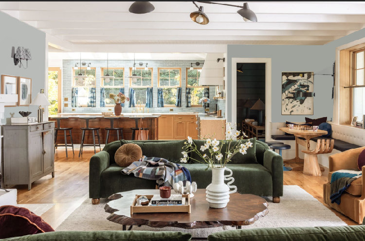 My opinion is a bolder wallpaper in the family room that ties the styles together would make it look more intentional.