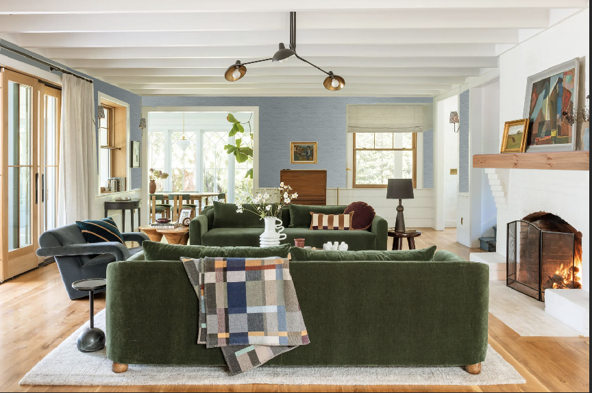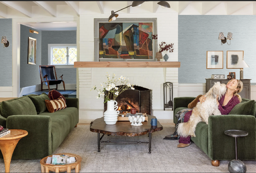 I think the new furniture looks great and love the green and gold combo. I can’t remember what your fireplace mantel is made of, but could you swap it out for a big solid piece of wood- ideally something that is or looks old and reclaimed? The white overall doesn’t bother me for the fireplace or the paneling, but I am excited to see the wallpaper samples. I would love to see how a small busy floral pattern in something darker/ higher contrast to the white would look.