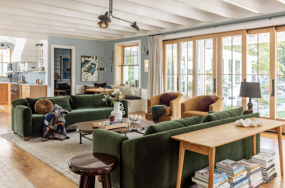 I LOVE the mustard chairs in this room. They pick up the wood tones in the room and make the whole space feel more cohesive. Also love the dark green sofas. Such a great shade of green.
